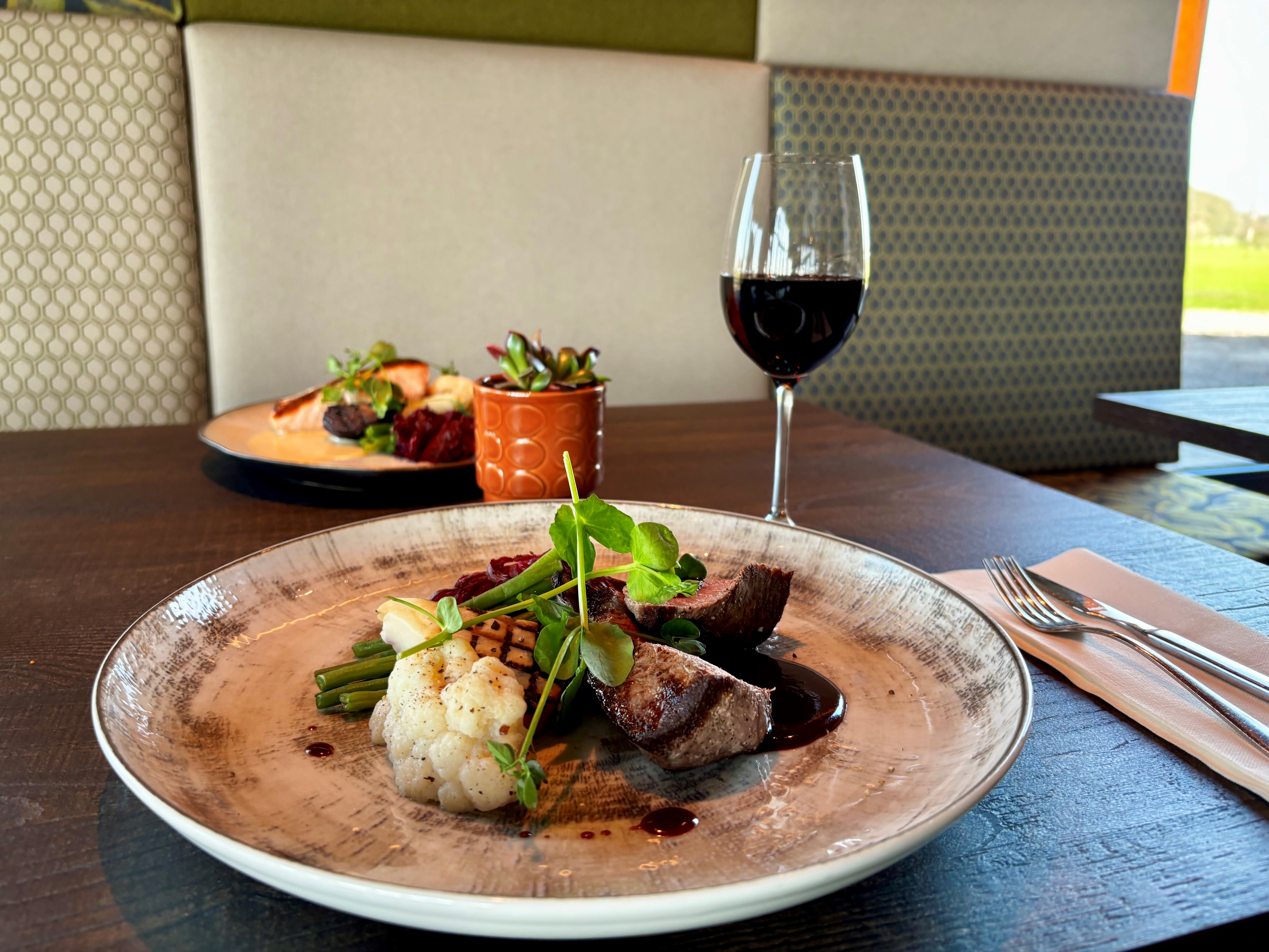 Geniet bijvoorbeeld van huisgemaakte groente loempia of Belgisch blauw biefstuk.